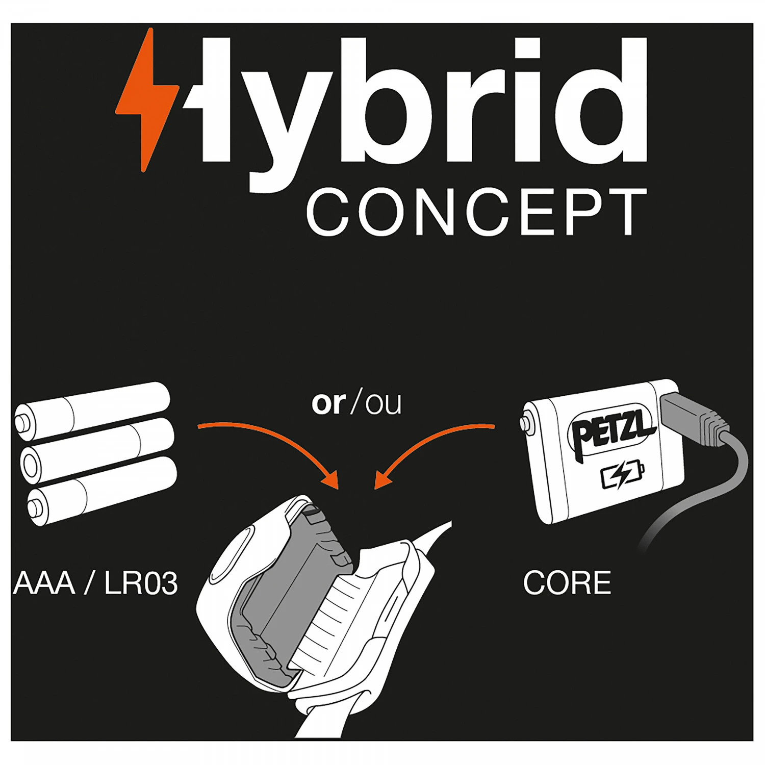 The Tactikka+ RGB head torch from Petzl guarantees maximum versatility in all terrain. It provides light for up to 160hrs and its white LEDs reach up to 90m. Red, blue or green lights are available for use at close range. In addition, the Tactikka+ RGB is equipped with a flashing light function as a highly visible signal which is visible for up to 400hrs and distances of up to 700m. The lightweight Petzl Hybrid head torch is powered by either the 3 AAA batteries which are included or the separately available Core rechargeable battery. The weatherproof torch is well prepared for use in rainy conditions.